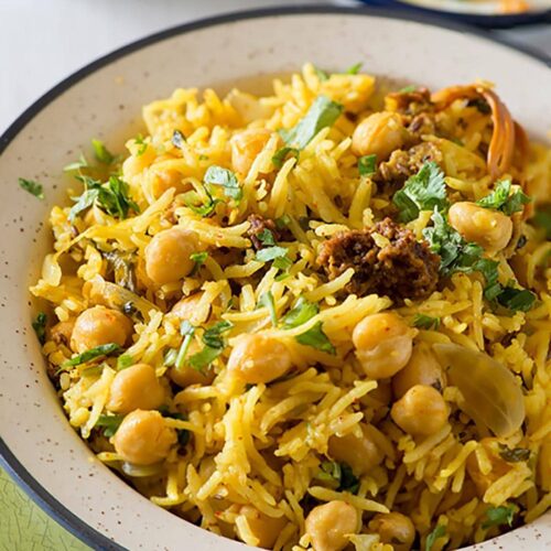 This delectable rice dish is known by many names. Chickpeas pulao, chana pulao, chickpeas pilaf or chickpeas rice. Call it by any name but served with a side dish of raita or plain yogurt this makes a delicious, nutritious and flavourful one pot meal.